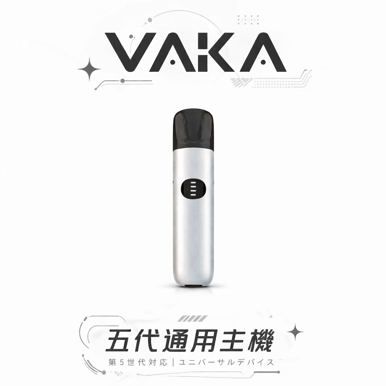 VAKA 五代通用主機,台灣現貨強勢登場!7W-8W三段功率自由切換,Type-C極速快充,完美兼容四代、五代、六代煙彈。專為追求極致客製化擊喉感與順滑細膩霧化的玩家設計,一機搞定多代煙彈,輕薄時尚、操作簡單,讓你輕鬆打造專屬口感,暢抽無界限!
